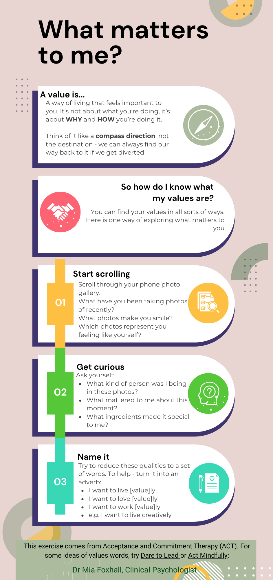Think of it like a compass direction, not the destination - we can always find our way back to it if we get diverted. Values are hidden throughout our daily decisions. Some might feel obvious, others take some exploration. Here is one way of exploring what matters to you.