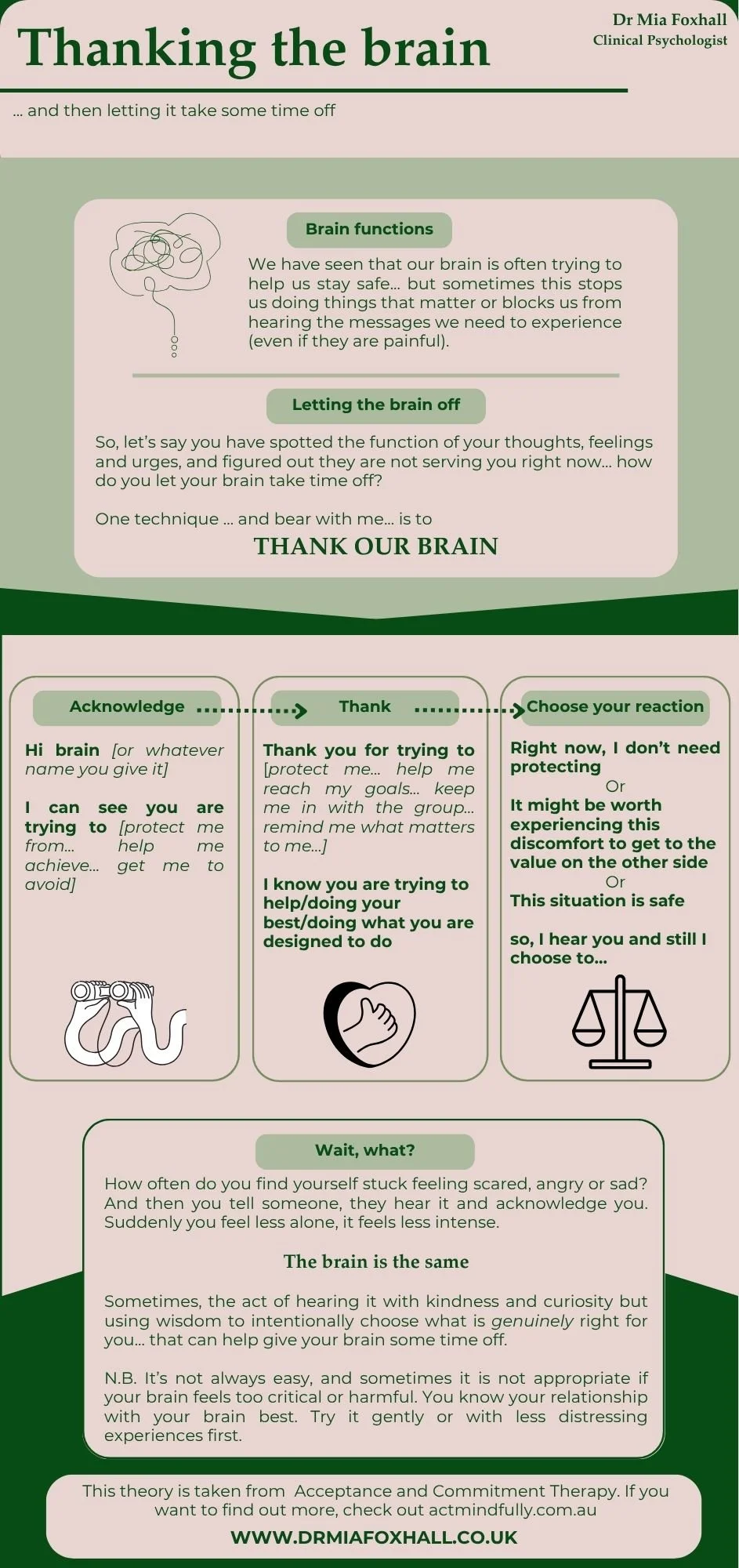 So, let’s say you have spotted the function of your thoughts, feelings and urges, and figured out they are not serving you right now... how do you let your brain take time off?